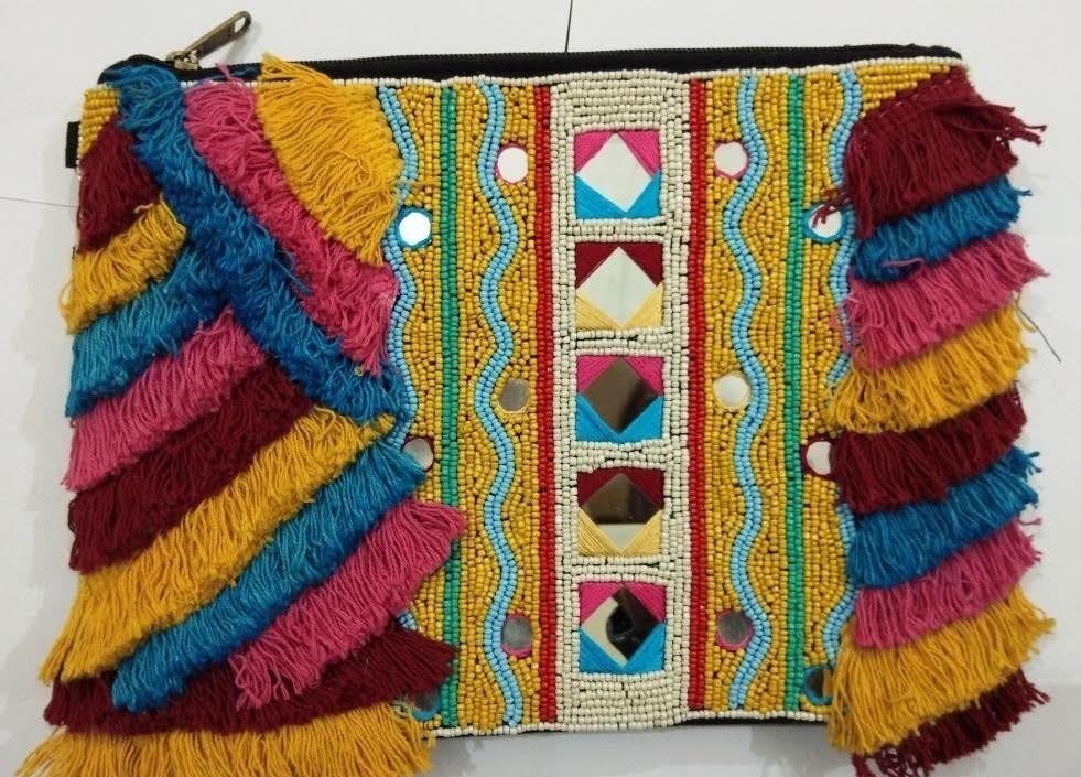 Add a bold splash of bohemian artistry to your outfit with the Festival Mirage Fringe Clutch . A kaleidoscope of color and texture, this clutch is a celebration of vibrant tribal craftsmanship and free-spirited energy.